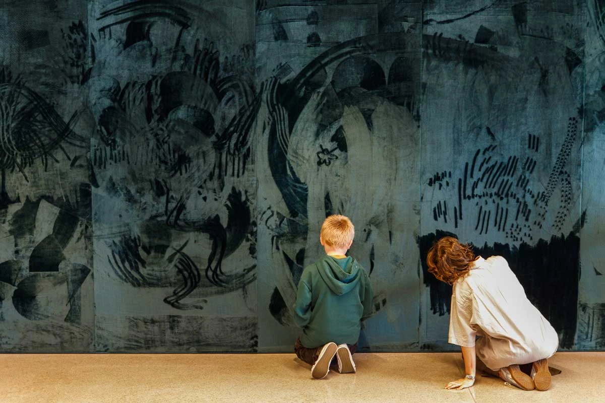 Kunstvermittler:innen begleiten die Gruppe im Ausstellungsraum und orientieren sich während des Rundgangs an Ideen, Fragen und Impulsen der Kinder.